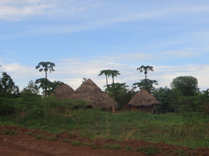Kleine tafeltjes en smalle bankjes. De community kijkt van een afstand toe hoe de muzungu (de blanke) buiten haar handen wast en dan het lokale eten eet, met de handen.